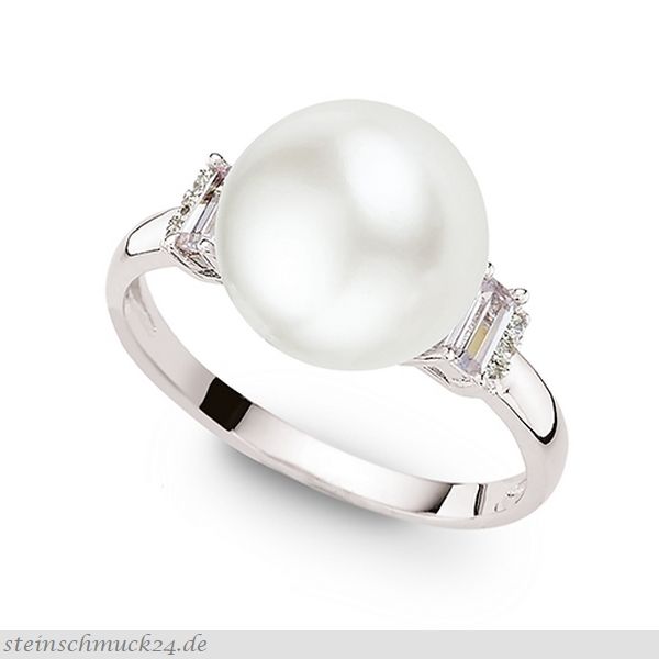 PEZI092-19190RIS / Ring (925er Sterlingsilber rhodiniert), Besatz (Süßwasser-Zuchtperle 10.5 mm, Zirkonia neutral), Schiene (mind. 2.3 mm breit, verlaufend, poliert), Ringgröße (56 mm Umfang) / 92.- €uro